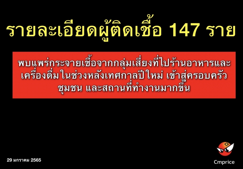 | • เชียงใหม่ พบแพร่กระจายเชื้อจากกลุ่มเสี่ยงที่ไปร้านอาหารและเครื่องดื่มในช่วงหลังเทศกาลปีใหม่ เข้าสู่ครอบครัว ชุมชน และสถานที่ทำงานมากขึ้น |