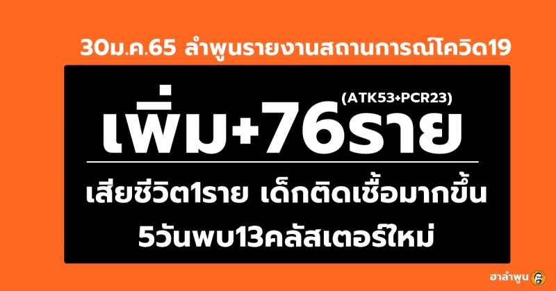 | • ลำพูนติดเชื้อเพิ่ม+76ราย มีผู้เสียชีวิต1ราย ผู้ติดเชื้อเป็นเด็กเพิ่มขึ้น- 30ม.ค.65 |