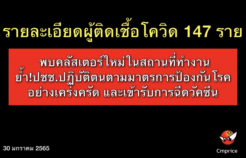 สถานการณ์การแพร่ระบาดของโรคโควิด-19 จังหวัดเชียงใหม่ วันนี้ (30 ม.ค. 65) พบผู้ติดเชื้อรายใหม่ 147 ราย เป็นผู้ติดเชื้อที่เดินทางมาจากต่างพื้นที่ 3 ราย ได้แก่ กรุงเทพมหานคร 1 ราย, ลำพูน 1 ราย และอุบลราชธานี 1 ราย ส่วนอีก144 ราย เป็นผู้ติดเชื้อในจังหวัด โดยมาจากคลัสเตอร์ใหม่และยังคงระบาดอยู่ 11 ราย จาก 6 คลัสเตอร์ ประกอบด้วยคลัสเตอร์ใหม่ วิทยาลัยเทคนิคเชียงใหม่ 4 ราย, คลัสเตอร์ใหม่ วอร์ดมหิดล โรงพยาบาลแมคคอร์มิค 3 ราย, คลัสเตอร์โครงการหลวงดอยคำ ตำบลแม่เหียะ 1 ราย, คลัสเตอร์บริษัท Yes Good Idea  ตำบลสุเทพ 1 ราย, คลัสเตอร์ใหม่ ธนาคารกรุงเทพ สาขาบ้านถวาย อำเภอหางดง 1 ราย และคลัสเตอร์ใหม่ บริษัทบีพีพาณิชย์ ตำบลช้างเผือก 1 ราย ส่วนใหญ่ยังคงเป็นการติดเชื้อจากการสัมผัสในที่ทำงานของพนักงานในหน่วยงานต่าง ๆ ทั้งหมด