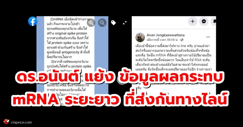31 ม.ค.65 ดร.อนันต์ จงแก้ววัฒนา นักไวรัสวิทยา ไบโอเทค สวทช. ได้โพสต์ข้อความผ่านเฟซบุ๊ก Anan Jongkaewwattana ระบุข้อความเกี่ยวกับ ข้อความที่ส่งกันในไลน์ เกี่ยวกับ วัคซีน mRNA ว่า จะทำให้เกิดผลเสียใน ระยะยาว