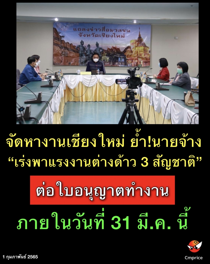 วันนี้ ( 1 ก.พ. 65 ) ที่ห้องประชุม 4 ชั้น 4 อาคารอำนวยการ ศาลากลางจังหวัดเชียงใหม่ นายวินัย ทองอุบล จัดหางานจังหวัดเชียงใหม่ เปิดเผยในการแถลงข่าวสื่อมวลชนประจำสัปดาห์ของจังหวัดเชียงใหม่ว่า ตามที่คณะรัฐมนตรีมีมติเมื่อวันที่ 13 กรกฎาคม 2564 เห็นชอบแนวทางการบริหารจัดการการทำงานของคนต่างด้าว 3 สัญชาติ ได้แก่ กัมพูชาลาว และเมียนมา ให้อยู่ในราชอาณาจักรและทำงานได้ต่อไปภายใต้สถานการณ์การแพร่ระบาดของโรคติดเชื้อไวรัสโคโรนา 2019 ถึงวันที่ 13 กุมภาพันธ์ 2566 สำนักงานจัดหางานจังหวัดเชียงใหม่จึงขอให้นายจ้างและสถานประกอบการพาแรงงานต่างด้าวมาดำเนินการต่ออายุใบอนุญาตทำงาน ภายในวันที่ 31 มีนาคม 2565 โดยไม่ต้องตรวจสุขภาพ กรณีแรงงานต่างด้าวสัญชาติเมียนมาที่ถือหนังสือรับรองบุคคล (CI) ให้ดำเนินการพาแรงงานต่างด้าวต่ออายุหนังสือรับรองบุคคล (CI) และขออนุญาตอยู่ต่อในราชอาณาจักร ได้ที่ศูนย์ฯ CI จังหวัดเชียงใหม่ บ้านเลขที่ 138 หมู่ 4 ตำบลท่าศาลา อำเภอเมือง จังหวัดเชียงใหม่ (ครัวปลาทองเดิม) ภายในวันที่ 1 สิงหาคม 2565