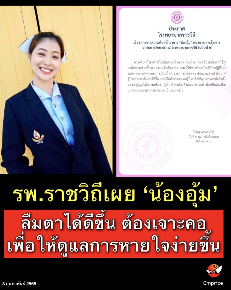 3 กุมภาพันธ์ 2565 โรงพยาบาลราชวิถีรายงานความคืบหน้าอาการ “น้องอุ้ม” พยาบาล รพ.อุ้มผาง ที่มารับการรักษาตัว ณ โรงพยาบาลราชวิถี ฉบับที่ 6 ระบุว่า