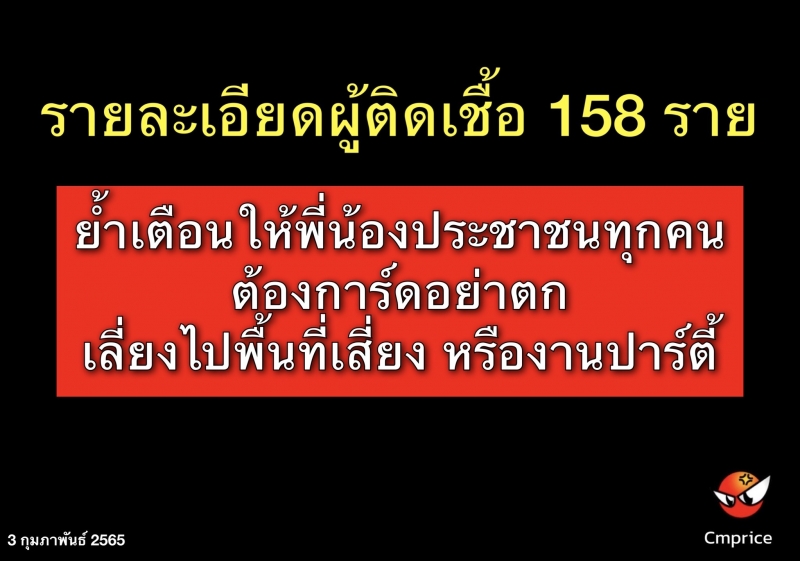 สถานการณ์ผู้ติดเชื้อรายใหม่ วันนี้ (3 ก.พ. 2565) พบผู้ติดเชื้อรายใหม่ 158 ราย ส่วนใหญ่เป็นผู้ติดเชื้อในจังหวัด 149 ราย ผู้ติดเชื้อจากต่างพื้นที่ 9 ราย ผู้ติดเชื้อรักษาหายวันนี้ 99 ราย สะสมทั้งหมด 32,890 ราย ส่วนผู้ติดเชื้อที่อยู่ระหว่างการสอบสวน และเชื่อมโยงกับ Cluster ต่างๆ มีจำนวน 31 ราย ผู้ติดเชื้อที่สัมผัสพื้นที่ระบาดในต่างพื้นที่ 9 ราย จากแม่ฮ่องสอน 2 ราย เชียงราย พะเยา แพร่ นครสวรรค์ ระยอง กทม. และลำพูน จังหวัดละ 1 ราย จำนวนผู้ติดเชื้อเฉพาะRT-PCR แยกรายอำเภอ วันนี้พบผู้ติดเชื้อกระจายไปหลายอำเภอมาก โดยพบมากสุด 5 อันดับแรก คือ อำเภอเมืองเชียงใหม่ 51 ราย (อยู่ในเขตเทศบาลนครเชียงใหม่ 39 ราย) สารภี 22 ราย หางดง 19 ราย สันทราย 18 ราย และแม่แตง 12 ราย