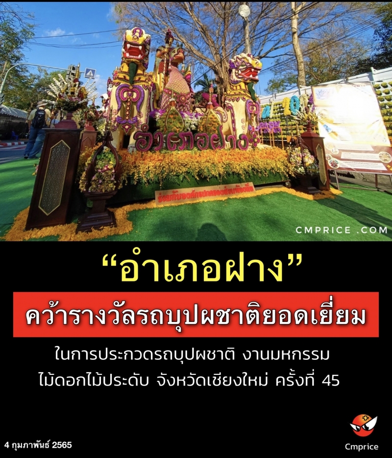 อำเภอฝาง คว้ารางวัลรถบุปผชาติยอดเยี่ยม รวม 2 ประเภท ทั้งประเภทอนุรักษ์ และประเภทสวยงาม ในการประกวดรถบุปผชาติ งานมหกรรมไม้ดอกไม้ประดับ จังหวัดเชียงใหม่ ครั้งที่ 45