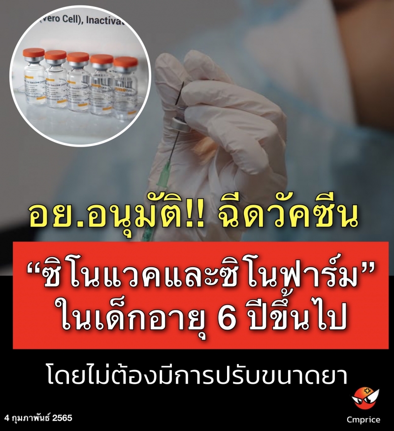 | • อย.อนุมัติฉีดวัคซีนซิโนแวคและซิโนฟาร์ม ในเด็กอายุ 6 ปีขึ้นไป โดยไม่ต้องมีการปรับขนาดยา |