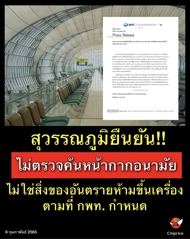 ท่าอากาศยานสุวรรณภูมิยืนยันไม่มีการตรวจค้นหน้ากากอนามัย เนื่องจากไม่ใช่สิ่งของอันตรายห้ามขึ้นเครื่องตามที่ กพท. กำหนด