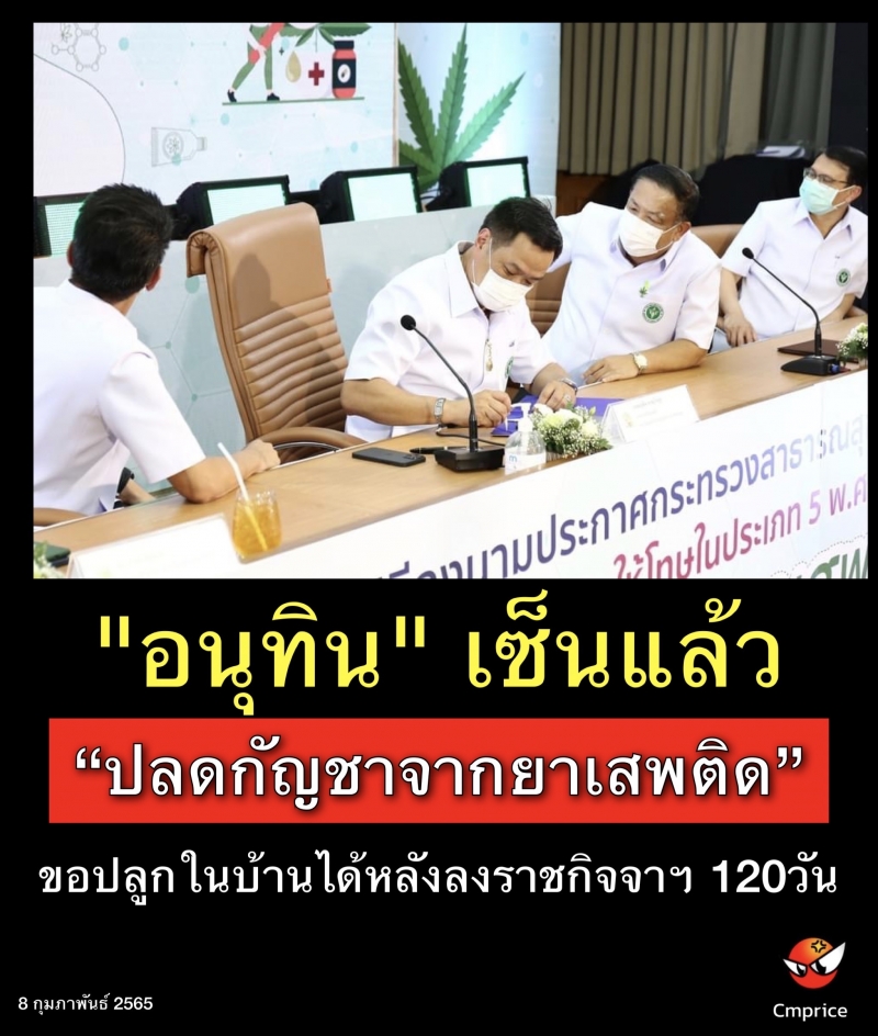 นายอนุทิน ชาญวีรกูล รองนายกรัฐมนตรีและรัฐมนตรีว่าการกระทรวงสาธารณสุข เป็นประธานในพิธีลงนามประกาศกระทรวงสาธารณสุข เรื่อง ระบุชื่อยาเสพติดให้โทษในประเภท 5 พ.ศ.2565 “ปลดกัญชาจากยาเสพติด”.2565 ออกจากยาเสพติดให้โทษประเภท 5 แล้ว โดยมี ดร.สาธิต ปิตุเตชะ รัฐมนตรีช่วยว่าการกระทรวงสาธารณสุข พร้อมด้วยนายแพทย์เกียรติภูมิ วงศ์รจิต ปลัดกระทรวงสาธารณสุข นายแพทย์ศุภกิจ ศิริลักษณ์ อธิบดีกรมวิทยาศาสตร์การแพทย์ และผู้บริหารกระทรวงสาธารณสุข ร่วมเป็นสักขีพยาน ณ ห้องประชุมชัยนาทนเรนทร อาคาร 1 สำนักงานปลัดกระทรวงสาธารณสุข วันที่ 8 กุมภาพันธ์ 2575 มีผลบังคับใช้หลังประกาศในราชกิจจาฯ 120 วัน สามารถจดแจ้งขอปลูกในบ้านได้ทันที เน้นใช้ประโยชน์ดูแลสุขภาพ ทางการแพทย์ ผลิตสินค้าต่างๆซึ่งกำหนดเฉพาะสารสกัดกัญชาที่มีทีเอชซีเกิน 0.2% เป็นยาเสพติด นอกเหนือจากนี้นำมาใช้ประโยชน์สร้างเสริมสุขภาพ สร้างรายได้ได้ และเพื่อให้เกิดความมั่นใจว่าจะไม่มีผู้ใดนำไปใช้ในทางที่ผิด จึงยื่นร่างกฎหมาย ร่าง พ.ร.บ.กัญชา กัญชง ต่อประธานสภาผู้แทนราษฎร ซึ่งท่านวินิจฉัยว่าเข้าข่ายกฎหมายด้านการเงิน ต้องส่งเรื่องกลับมาให้นายกรัฐมนตรีพิจารณาว่ามีปัญหาขัดข้องหรือไม่
