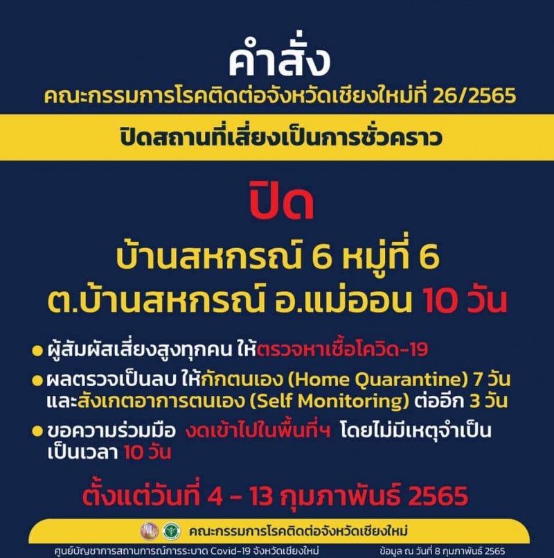 นายประจญ ปรัชญ์สกุล ผู้ว่าราชการจังหวัดเชียงใหม่ ในฐานะประธานคณะกรรมการโรคติดต่อจังหวัดเชียงใหม่ ผู้กำกับการบริหารราชการในสถานการณ์ฉุกเฉินจังหวัดเชียงใหม่ ลงนามคำสั่งคณะกรรมการโรคติดต่อจังหวัดเชียงใหม่ เรื่อง ปิดสถานที่เสี่ยงเป็นการชั่วคราว หลังพบการติดเชื้อโรคโควิด–19 เป็นกลุ่มก้อน โดยให้ปิดพื้นที่เสี่ยง 3 แห่ง ประกอบด้วย ร้านลาบลุงคำ หมู่ที่ 8 ตำบลเชียงดาว อำเภอเชียงดาว เป็นระยะเวลา 5 วัน ตั้งแต่วันที่ 7 - 11 กุมภาพันธ์ ,หอพักป้าบัวจันทร์ ลุงทองอิน เลขที่ 94/1 หมู่ที่ 7 ตำบลสันผักหวาน อำเภอหางดง เป็นระยะเวลา 10 วัน ตั้งแต่วันที่ 4 - 13 กุมภาพันธ์ และพื้นที่บ้านสหกรณ์ 6 หมู่ที่ 6 ตำบลบ้านสหกรณ์ อำเภอแม่ออน เป็นระยะเวลา 10 วัน ตั้งแต่วันที่ 4 – 13 กุมภาพันธ์ พร้อมขอความร่วมมือประชาชนงดการเดินทางเข้าไปในพื้นที่ดังกล่าว โดยไม่มีเหตุจำเป็น เพื่อลดความเสี่ยงต่อการสัมผัสโรค