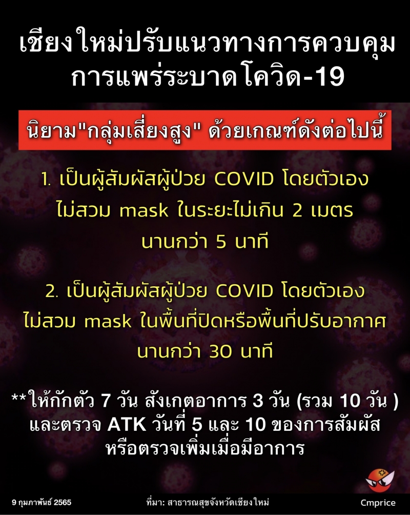 | • เชียงใหม่ปรับแนวทางการควบคุมการแพร่ระบาดโควิด-19 ตามแนวทางที่กรมควบคุมโรคกำหนด |