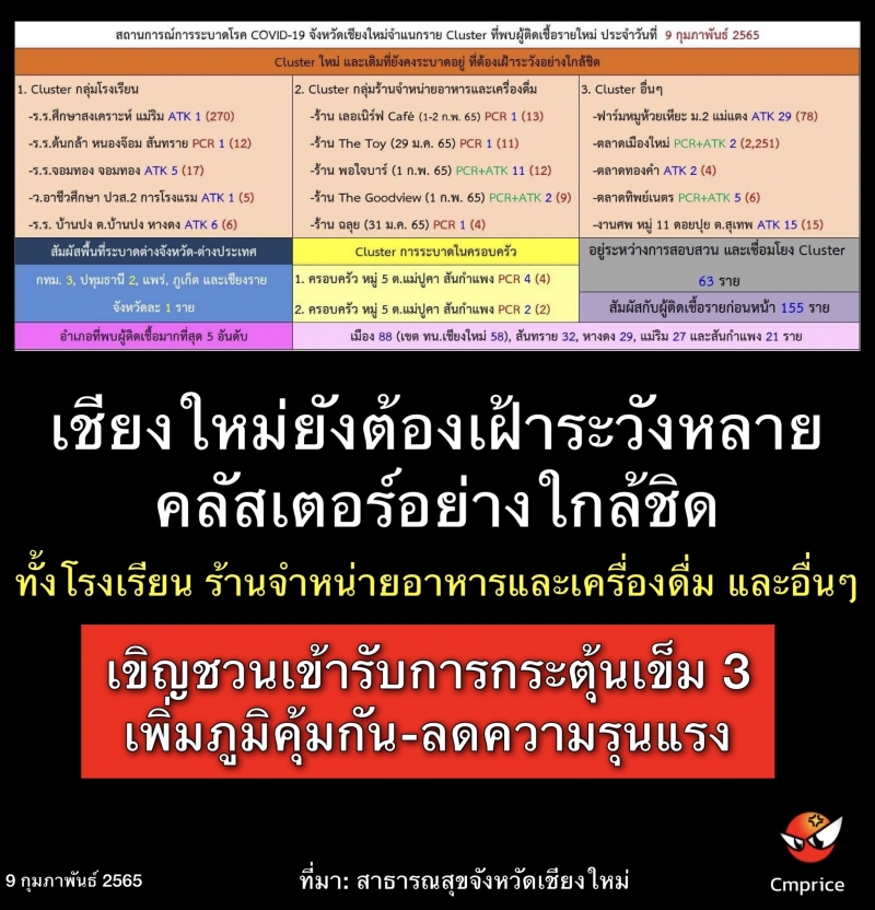 โดยขณะนี้มีคลัสเตอร์ที่ยังต้องเฝ้าระวังอย่างใกล้ชิดอยู่ 3 คลัสเตอร์ใหญ่ ประกอบด้วย คลัสเตอร์กลุ่มโรงเรียน 14 ราย ในอำเภอจอมทอง อำเภอหางดง อำเภอเมือง อำเภอแม่ริม และอำเภอสันทราย, คลัสเตอร์กลุ่มร้านจำหน่ายอาหารและเครื่องดื่ม 16 ราย และกลุ่มคลัสเตอร์อื่น ๆ ที่มีการติดตามอีก 53 ราย ขณะที่การระบาดในครอบครัว พบเพิ่ม 6 ราย นอกจากนี้ ยังมีผู้ติดเชื้อที่สัมผัสกับผู้ติดเชื้อรายก่อนหน้าอีก 155 ราย และอยู่ระหว่างการสอบสวนโรคเชื่อมโยงคลัสเตอร์อีก 63 ราย