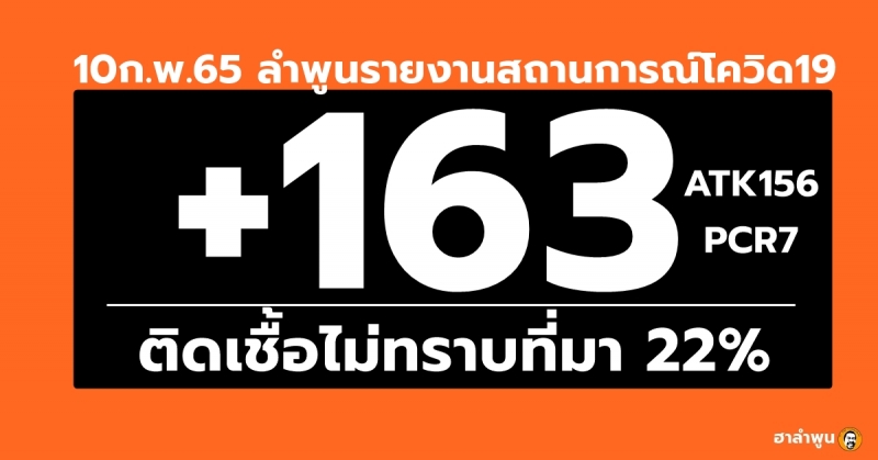 10 ก.พ. 65 เพจศูนย์ข่าวโควิด 19 ลำพูน แถลงสถานการณ์โควิด-19 จ.ลำพูน โดยเป็นข้อมูล ณ เมื่อวานนี้ เวลา 16.00น. พบผู้ติดเชื้อเพิ่ม 163ราย แบ่งเป็นการตรวจ RT-PCR ในจังหวัด 3ราย เป็นการตรวจ ATK 156ราย และ จากต่างจังหวัด4ราย (สามารถดูและฟังแถลง ได้ข้างล่าง )