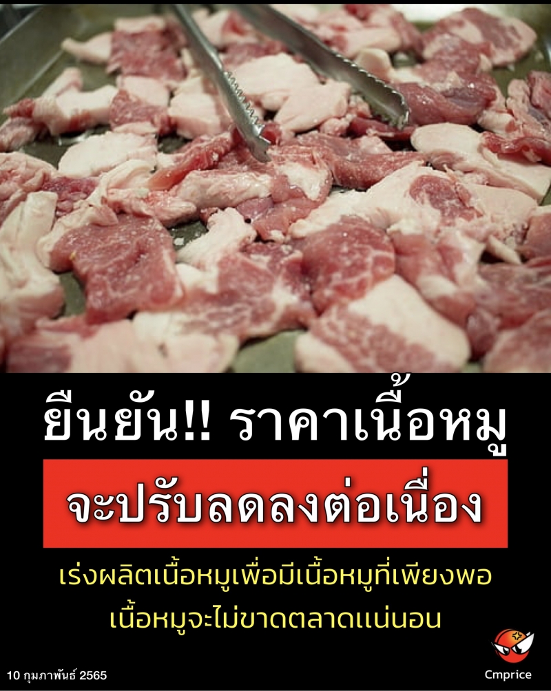 | • ยืนยันราคาเนื้อหมูจะปรับลดลงต่อเนื่อง ขณะนี้เร่งผลิตเนื้อหมูเพื่อมีเนื้อหมูที่เพียงพอ |