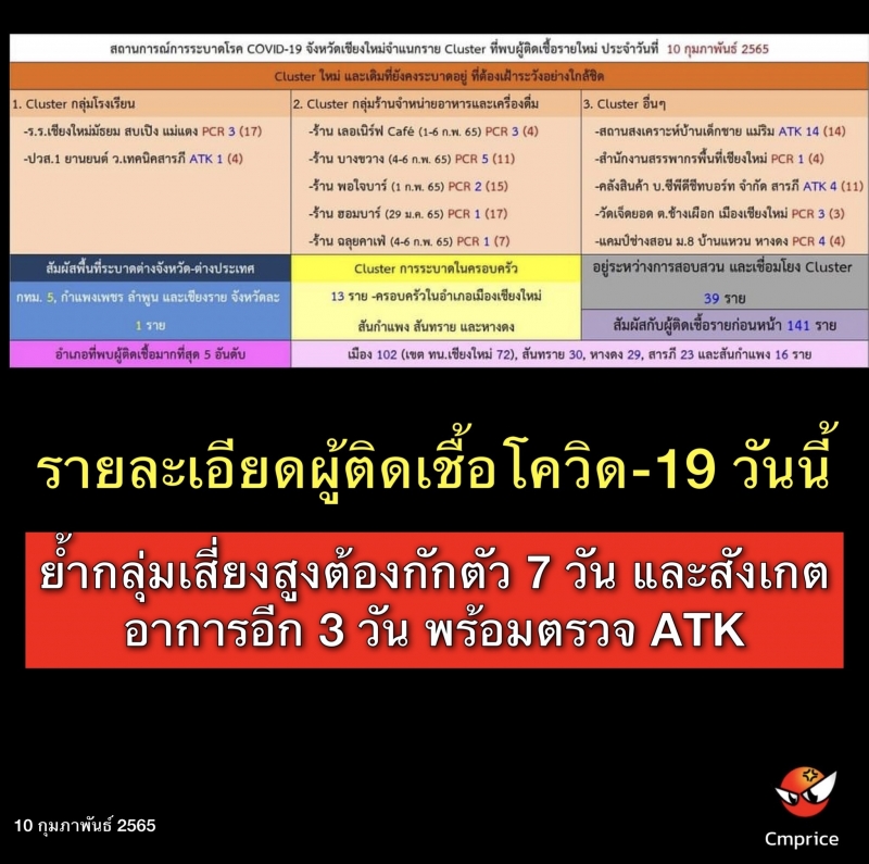 สถานการณ์การแพร่ระบาดโรคโควิด-19 จังหวัดเชียงใหม่ วันนี้ (10 ก.พ.65) พบผู้ติดเชื้อรายใหม่ เพิ่ม 261 ราย โดยเป็นผู้ติดเชื้อจากต่างจังหวัด 8 ราย ประกอบด้วย กรุงเทพมหานคร 5 ราย กำแพงเพชร ลำพูน และเชียงราย จังหวัดละ1 ราย ส่วนที่เหลืออีก 253 ราย เป็นผู้ติดเชื้อในจังหวัด  โดยในขณะนี้มีคลัสเตอร์ที่ยังต้องเฝ้าระวังอย่างใกล้ชิดประกอบด้วย คลัสเตอร์กลุ่มโรงเรียน 2 คลัสเตอร์ ได้แก่ โรงเรียนเชียงใหม่มัธยม ฝั่งประถมศึกษา ตำบลสบเปิงอำเภอแม่แตง ตรวจ RT-PCR พบเพิ่ม 3 ราย ยอดรวม 17 ราย และวิทยาลัยเทคนิคสารภี ชั้น ปวส.1 แผนกยานยนต์ตำบลหนองผึ้ง อำเภอสารภี ตรวจ ATK พบเพิ่ม 1 ราย ยอดรวม 4 ราย