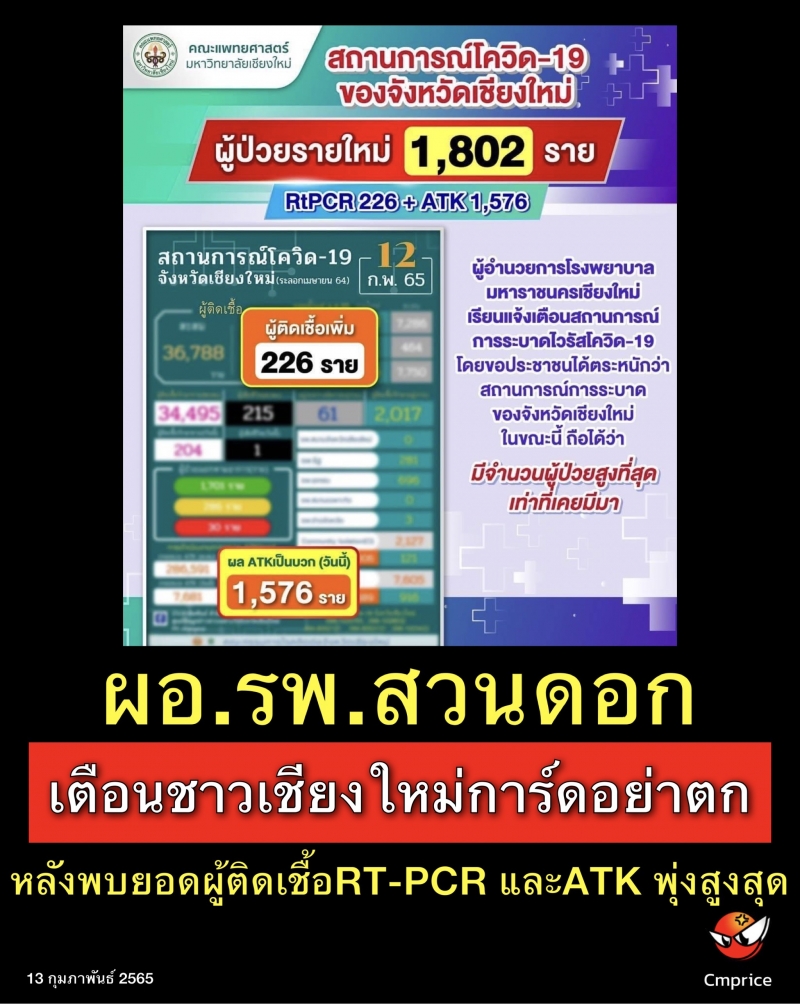 ผู้อำนวยการโรงพยาบาลมหาราชนครเชียงใหม่เตือนชาวเชียงใหม่อย่าการ์ดตก หลังยอดผู้ติดเชื้อ ATK และ RT-PCR ในเชียงใหม่พุ่งสูงสุดมาหลายวัน หวั่นผู้ป่วยหนักเพิ่มกระทบอัตรากำลังแพทย์พยาบาล และธุรกิจเชียงใหม่