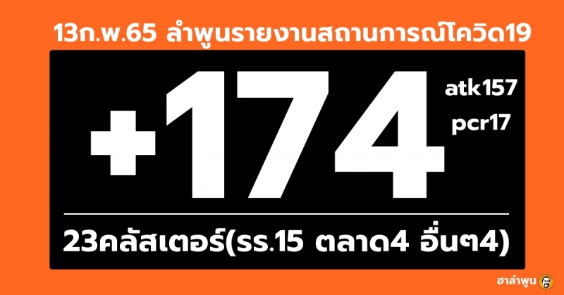 13 ก.พ. 65 เพจศูนย์ข่าวโควิด 19 ลำพูน แถลงสถานการณ์โควิด-19 จ.ลำพูน โดยเป็นข้อมูล ณ เมื่อวานนี้ เวลา 16.00น. พบผู้ติดเชื้อเพิ่ม 174ราย แบ่งเป็นการตรวจ RT-PCR ในจังหวัด 13ราย เป็นการตรวจ ATK 157ราย และ จากต่างจังหวัด 4ราย