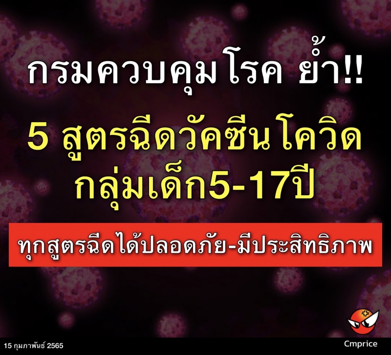 | • กรมควบคุมโรค ย้ำ !! 5 สูตรฉีดวัคซีนโควิด กลุ่มเด็ก 5-17 ปี ทุกสูตรฉีดได้ปลอดภัยและมีประสิทธิภาพ |