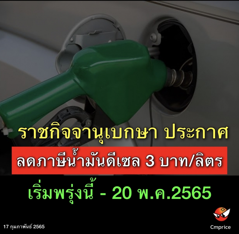 | • ด่วน ครม.ลดภาษีน้ำมันดีเซล 3 บาท/ลิตร นาน 3 เดือน มีผลใช้บังคับถึงวันที่ 20 พ.ค. 2565 |
