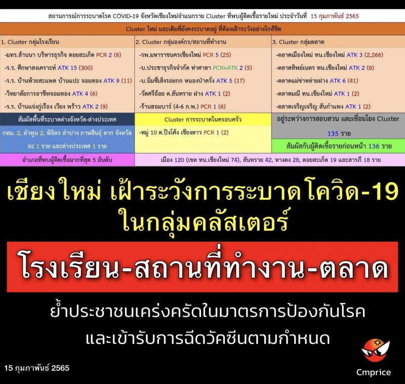 สถานการณ์การแพร่ระบาดโรคโควิด-19 จังหวัดเชียงใหม่ วันนี้ (15 ก.พ. 65) พบผู้ติดเชื้อรายใหม่เพิ่ม 294 ราย โดยเป็นผู้ติดเชื้อจากต่างพื้นที่ 9 ราย ได้แก่ กรุงเทพมหานคร 2 ราย ลำพูน 2 ราย พิจิตร ลำปาง กาฬสินธุ์ ตาก จังหวัดละ 1 ราย และต่างประเทศ 1 ราย ส่วนอีก 285 ราย เป็นผู้ติดเชื้อในจังหวัด โดยขณะนี้มีกลุ่มคลัสเตอร์ที่ต้องเฝ้าระวังอย่างใกล้ชิดอยู่ 3 กลุ่ม ประกอบด้วย คลัสเตอร์กลุ่มโรงเรียน ได้แก่ มหาวิทยาลัยเทคโนโลยีราชมงคลล้านนา สาขาบริหารธุรกิจ วิทยาเขตดอยสะเก็ด ,โรงเรียนศึกษาสงเคราะห์ อำเภอแม่ริม , โรงเรียนบ้านห้วยสะแพด อำเภอจอมทองวิทยาลัยการอาชีพจอมทอง และ โรงเรียนบ้านแจ่งกู่เรือง อำเภอพร้าว ด้านคลัสเตอร์กลุ่มองค์กร/สถานที่ทำงานได้แก่ โรงพยาบาลมหาราชนครเชียงใหม่ , บริษัทประชาธุรกิจจำกัด ตำบลท่าศาลา , บริษัทนิ่มซี่เส็งรถยก ตำบลหนองป่าครั่ง , วัดศรีถ้อย อำเภอฝาง , ร้านฮอมบาร์ (สำหรับผู้ไปใช้บริการวันที่ 4-6 กุมภาพันธ์ 2565) ส่วนคลัสเตอร์กลุ่มตลาด ได้แก่ ตลาดเมืองใหม่ , ตลาดทิพย์เนตร , ตลาดแม่ข่าหล่ายฝาง , ตลาดมณี และตลาดเจริญ เจริญ ตำบลสันกลาง อำเภอสันกำแพง