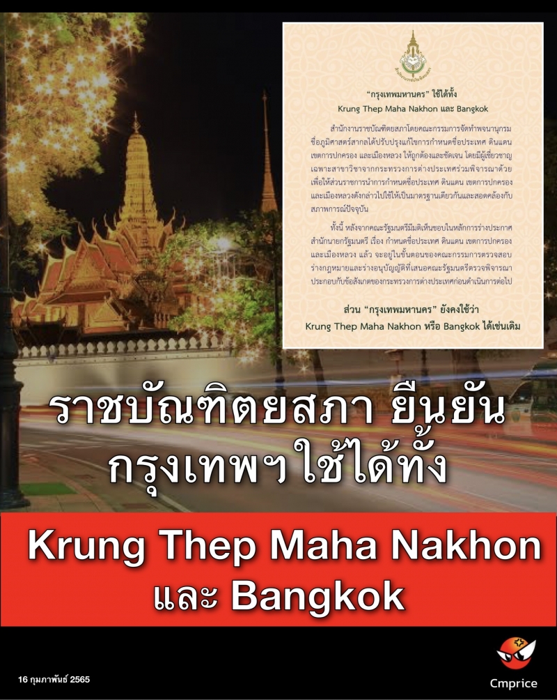 ราชบัณฑิตยสภา ยืนยันประกาศเปลี่ยนชื่อภาษาอังกฤษเมืองหลวงของประเทศไทย "กรุงเทพ มหานคร" ใช้ได้ทั้ง“Krung Thep Maha Nakhon “ และ ”Bangkok”