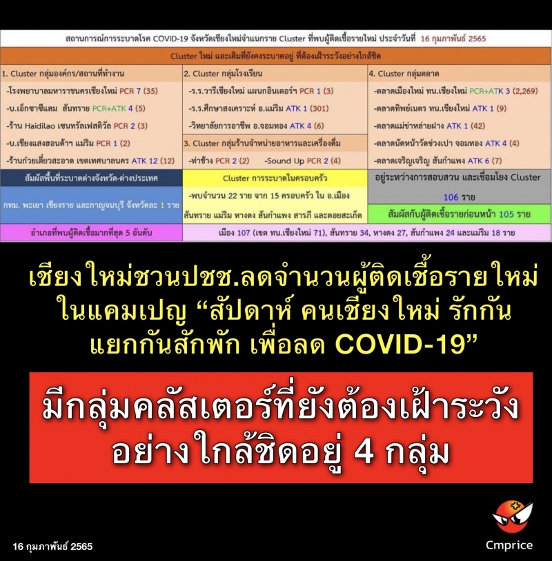 สถานการณ์การแพร่ระบาดโรคโควิด-19 จังหวัดเชียงใหม่ วันนี้ (16 ก.พ. 65) พบผู้ติดเชื้อรายใหม่เพิ่ม 277 ราย โดยเป็นผู้ติดเชื้อจากต่างจังหวัดเพียง 4 ราย ได้แก่ กรุงเทพฯ พะเยา เชียงราย และกาญจนบุรี จังหวัดละ 1 ราย ส่วนที่เหลืออีก 273 ราย เป็นผู้ติดเชื้อในจังหวัด โดยขณะนี้มีกลุ่มคลัสเตอร์ที่ยังต้องเฝ้าระวังอย่างใกล้ชิดอยู่ 4 กลุ่ม ได้แก่คลัสเตอร์กลุ่มสถานศึกษา พบเพิ่ม 3 แห่ง ได้แก่ โรงเรียนวารีเชียงใหม่ แผนกอินเตอร์เนชั่นแนล ตรวจ RT-PCR พบเพิ่ม 1 ราย ยอดรวม 3 ราย ,โรงเรียนศึกษาสงเคราะห์ ตำบลดอนแก้ว อำเภอแม่ริม ตรวจ ATK พบเพิ่ม 1 ราย,วิทยาลัยการอาชีพ อำเภอจอมทอง ตรวจ ATK พบเพิ่ม 4 ราย และโรงเรียนรัตนาเอื้อวิทยา อำเภอฝาง ตรวจ ATK พบเพิ่ม 1 ราย ยอดรวม 2 ราย ด้านคลัสเตอร์กลุ่มร้านจำหน่ายอาหารและเครื่องดื่ม พบเพิ่ม 2 ร้าน ได้แก่ ร้านท่าช้างอำเภอเมืองเชียงใหม่ ตรวจ RT-PCR พบใหม่ 2 ราย และร้าน Sound Up ตรวจ RT-PCR พบเพิ่ม 2 ราย ยอดรวม 4 ราย