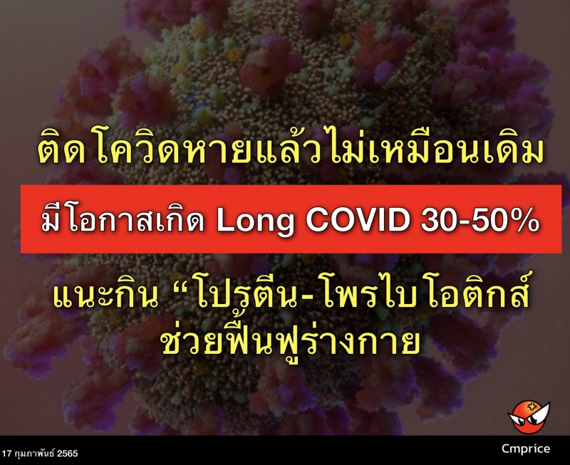 | • ติดโควิดหายแล้วไม่เหมือนเดิม มีโอกาสเกิด Long COVID 30-50% แนะกิน โปรตีน-โพรไบโอติกส์ช่วยฟื้นฟูร่างกาย |