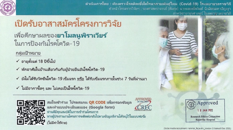 รพ.ราชวิถี เปิดรับอาสาสมัครโครงการวิจัย เพื่อศึกษาผลของยาโมลนูพิราเวียร์ ในการป้องกันโรคโควิด-19