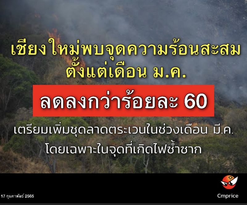 | • เชียงใหม่พบจุดความร้อนสะสมตั้งแต่เดือนมกราคม ลดลงกว่าร้อยละ 60 |