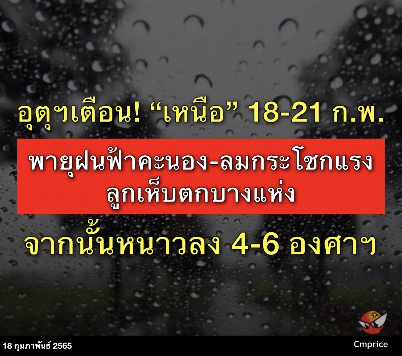 | • อุตุฯเตือน! เหนือ 18-21 ก.พ. อากาศแปรปรวน พายุฝนฟ้าคะนอง ลูกเห็บตก จากนั้นหนาวลง 4-6 องศาฯ |