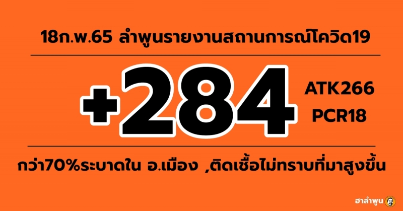 18 ก.พ. 65 เพจศูนย์ข่าวโควิด 19 ลำพูน แถลงสถานการณ์โควิด-19 จ.ลำพูน โดยเป็นข้อมูล ณ เมื่อวานนี้ เวลา 16.00น. พบผู้ติดเชื้อเพิ่ม 284ราย แบ่งเป็นการตรวจ RT-PCR ในจังหวัด 18ราย เป็นการตรวจ ATK 266ราย ไม่มีมาจากต่างจังหวัด