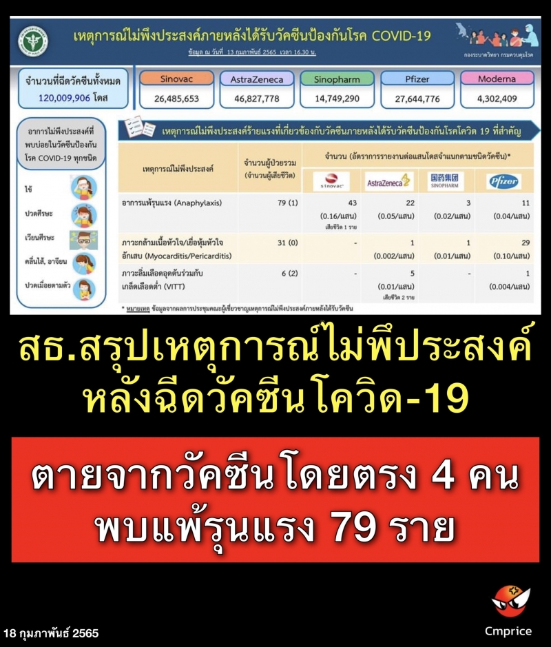 18 ก.พ.65 นพ.เฉวตสรร นามวาท ผู้อำนวยการกองควบคุมโรคและภัยสุขภาพในภาวะฉุกเฉิน กรมควบคุมโรคกระทรวงสาธารณสุข (สธ.) เผยถึงระบบเฝ้าระวังเหตุการณ์ไม่พึงประสงค์หลังฉีดวัคซีน ติดตามอาการ 30 วัน ว่าขณะนี้วัคซีนฉีดไปแล้วมากกว่า 120 ล้านโดส ส่วนใหญ่พบอาการข้างเคียงไม่รุนแรง เช่น ไข้ ปวดศีรษะ เวียนศีรษะ คลื่นไส้อาเจียน ปวดเมื่อยตามตัว ขณะที่ตรวจพบเหตุการณ์ไม่พึงประสงค์ร้ายแรง ดังนี้