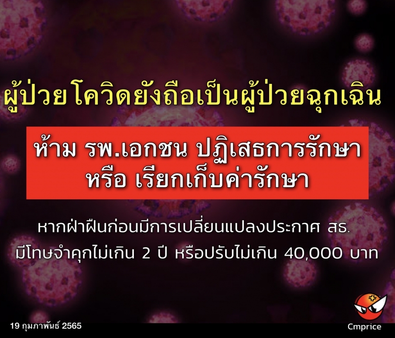 | • สบส. ชี้ผู้ป่วยโควิดยังถือเป็นผู้ป่วยฉุกเฉิน ห้าม รพ.เอกชน ปฏิเสธการรักษาหรือเรียกเก็บค่ารักษา |