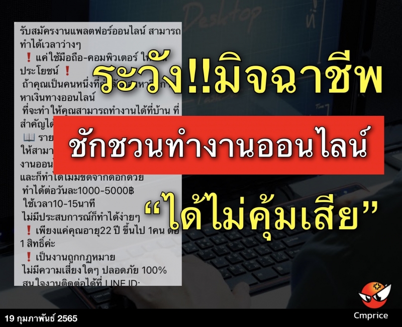 ตำรวจสอบสวนกลางขอเตือน หากท่านมีข้อความที่คล้ายคลึงกับข้อควมดังกล่าวหรือชักชวนให้ทำงานผ่านออนไลน์ที่ได้เงินง่ายเกินจริง อย่าหลงเชื่อ หรือรับงานมาทำ