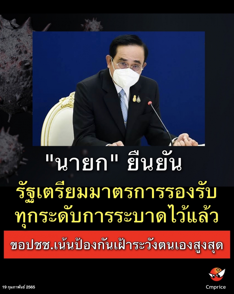 พล.อ. ประยุทธ์ จันทร์โอชา นายกฯ และ รมว.กลาโหม ห่วงใยพี่น้องประชาชน สถานการณ์การระบาดของสายพันธุ์โอมิครอนส่งผลให้จำนวนผู้ติดเชื้อพุ่งสูงขึ้นเป็นจำนวนมากขณะนี้ ยืนยันรัฐบาลเตรียมมาตรการรองรับทุกระดับการระบาดไว้แล้ว ทั้งความพร้อมด้านโรงพยาบาล สถานที่รักษา ยา และเวชภัณฑ์ต่าง ๆ