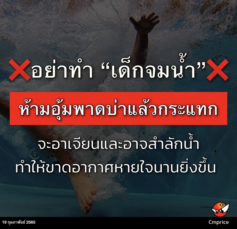 | • อย่าทำ "เด็กจมน้ำ" ห้ามอุ้มพาดบ่าแล้วกระแทก จะอาเจียนและอาจสำลักน้ำ ทำให้ขาดอากาศหายใจนานยิ่งขึ้น |
