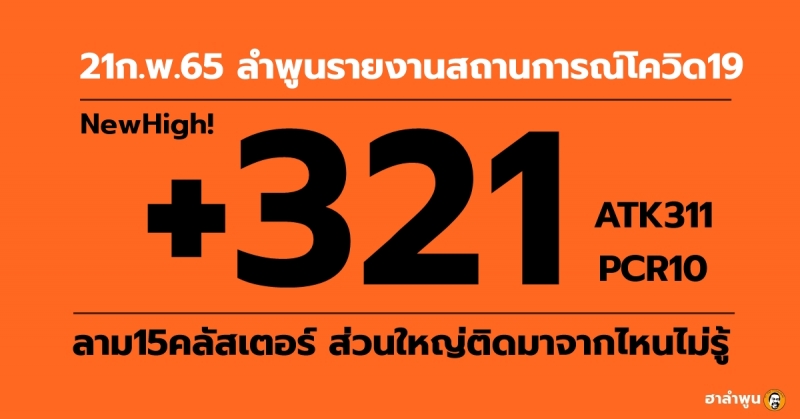 21 ก.พ. 65  เพจศูนย์ข่าวโควิด 19 ลำพูน  แถลงสถานการณ์โควิด-19 จ.ลำพูน โดยเป็นข้อมูล ณ เมื่อวานนี้ เวลา 16.00น. พบผู้ติดเชื้อเพิ่ม 321ราย แบ่งเป็นการตรวจ RT-PCR ในจังหวัด 9ราย  เป็นการตรวจ ATK 311ราย  มาจากต่างจังหวัด 1ราย