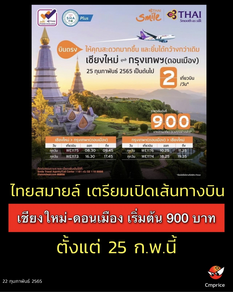 วันนี้ ( 22 ก.พ. 65 ) ที่ห้องประชุม 4 ชั้น 4 อาคารอำนวยการ ศาลากลางจังหวัดเชียงใหม่ นายธนะพัฒน์ วรยศพันธ์ภานุ ผู้จัดการฝ่ายขายและจัดจำหน่าย บริษัทไทยสมายล์ เปิดเผยในการแถลงข่าวสื่อมวลชนประจำสัปดาห์ของจังหวัดเชียงใหม่ว่า สายการบินไทยสมายล์ ได้เพิ่มความสะดวกให้แก่ผู้โดยสารในการเดินทางมากยิ่งขึ้น โดยเดินหน้าขยายฐานปฏิบัติการบินจากจังหวัดเชียงใหม่ซึ่งเมืองท่องเที่ยวเศรษฐกิจที่สำคัญสู่ท่าอากาศยานดอนเมือง โดยให้บริการวันละ 2 เที่ยวบิน พร้อมมอบบริการฟูลเซอร์วิสเช่นเดิม ทั้ง เลือกที่นั่งได้ บริการฟรีน้ำหนักกระเป๋าสูงสุด 20 กิโลกรัมและให้บริการอาหารบนเที่ยวบินกลับไปรับประทานได้
