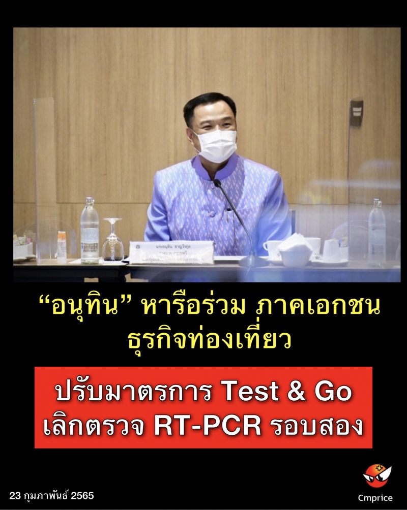 วันนี้ (22 กุมภาพันธ์ 2565) ที่ โรงแรมแกรนด์ริชมอนด์ จ.นนทบุรี นายอนุทิน ชาญวีรกูล รองนายกรัฐมนตรีและรัฐมนตรีว่าการกระทรวงสาธารณสุข พร้อมด้วย นพ.ธงชัย เลิศวิไลรัตนพงศ์ รองปลัดกระทรวงสาธารณสุข นพ.โอภาส การย์กวินพงศ์ อธิบดีกรมควบคุมโรค นายยุทธศักดิ์ สุภสร ผู้ว่าการการท่องเที่ยวแห่งประเทศไทย ผู้บริหารจากกระทรวงสาธารณสุข กระทรวงมหาดไทย กระทรวงการท่องเที่ยวและกีฬา กระทรวงการต่างประเทศ สภาอุตสาหกรรมท่องเที่ยว สมาคมธุรกิจท่องเที่ยว สมาคมโรงแรม ร่วมหารือแนวทางการปรับมาตรการป้องกันโรคโควิด 19 สำหรับการเดินทางเข้าราชอาณาจักรประเภท Test & Go