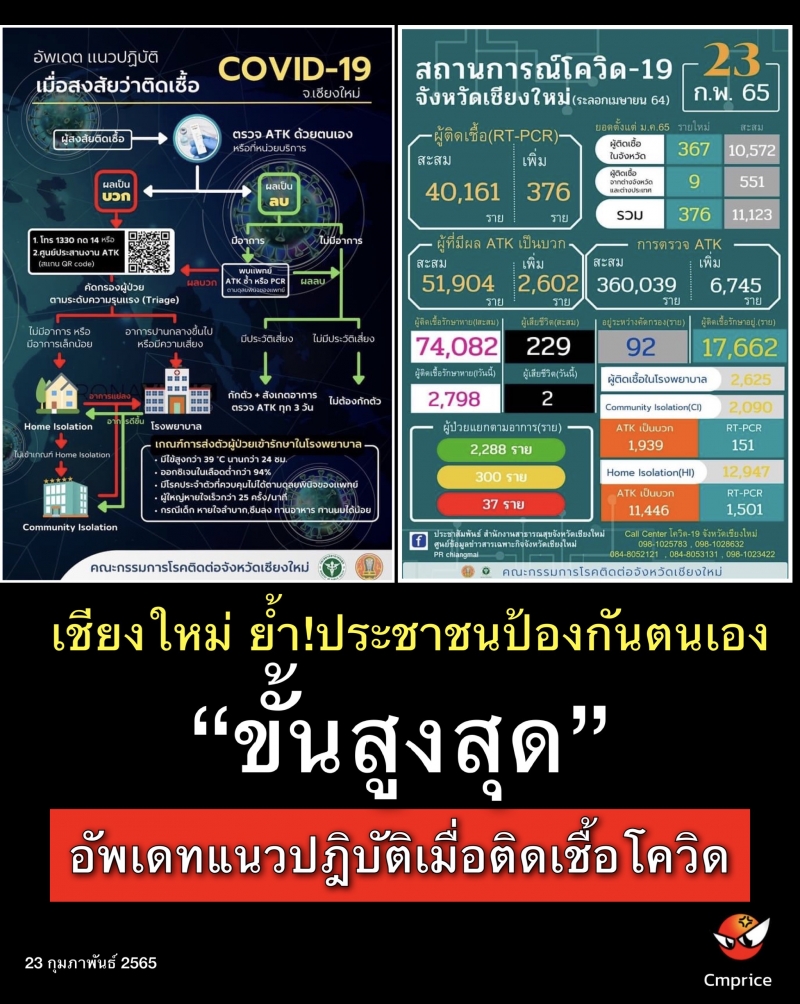ด้านการรายงานสถานการณ์โควิด-19 จังหวัดเชียงใหม่ ได้ปรับการรายงานในภาพรวม ด้วยสถานการณ์ในตอนนี้มีการแพร่ระบาดไปทุกกลุ่ม ทั้งโรงเรียน สถานที่ทำงาน และชุมชนต่าง ๆ โดยสิ่งที่สำคัญ คืออยากให้ประชาชนเกิดความตระหนัก และป้องกันตนเองอย่างเคร่งครัด ส่วนมาตรการการปิดร้านหรือสถานประกอบการนั้น จะต้องพิจารณาสถานการณ์การระบาดแต่ละจุดพื้นที่ เพื่อให้การป้องกันและควบคุมโรคโควิด-19 เดินหน้าควบคู่ไปกับเศรษฐกิจ ผู้ประกอบการอยู่ได้ และลดความเดือดร้อนของประชาชน ขณะที่สถานการณ์โควิด-19 จังวัดเชียงใหม่วันนี้ พบผู้ติดเชื้อยืนยัน 376 ราย และพบผู้ติดเชื้อเข้าข่าย 2,602 ราย จากการตรวจ ATK ทั้งหมด 6,745 ราย และมีผู้เสียชีวิต 2 ราย