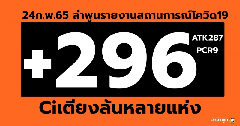 24 ก.พ. 65 เพจศูนย์ข่าวโควิด 19 ลำพูน แถลงสถานการณ์โควิด-19 จ.ลำพูน โดยเป็นข้อมูล ณ เมื่อวานนี้ เวลา 16.00น. พบผู้ติดเชื้อเพิ่ม 296ราย แบ่งเป็นการตรวจ RT-PCR ในจังหวัด 8ราย เป็นการตรวจ ATK 287ราย มาจากต่างจังหวัด 1ราย
