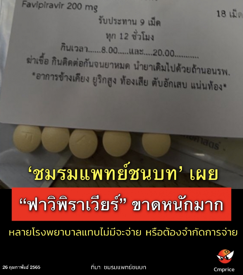 26 กุมภาพันธ์ 2565 ชมรมแพทย์ชนชบ โพสเพซบุ๊ก ระบุถึงสถานการณ์ การขาดแคลนยา ฟาวิพิราเวียร์