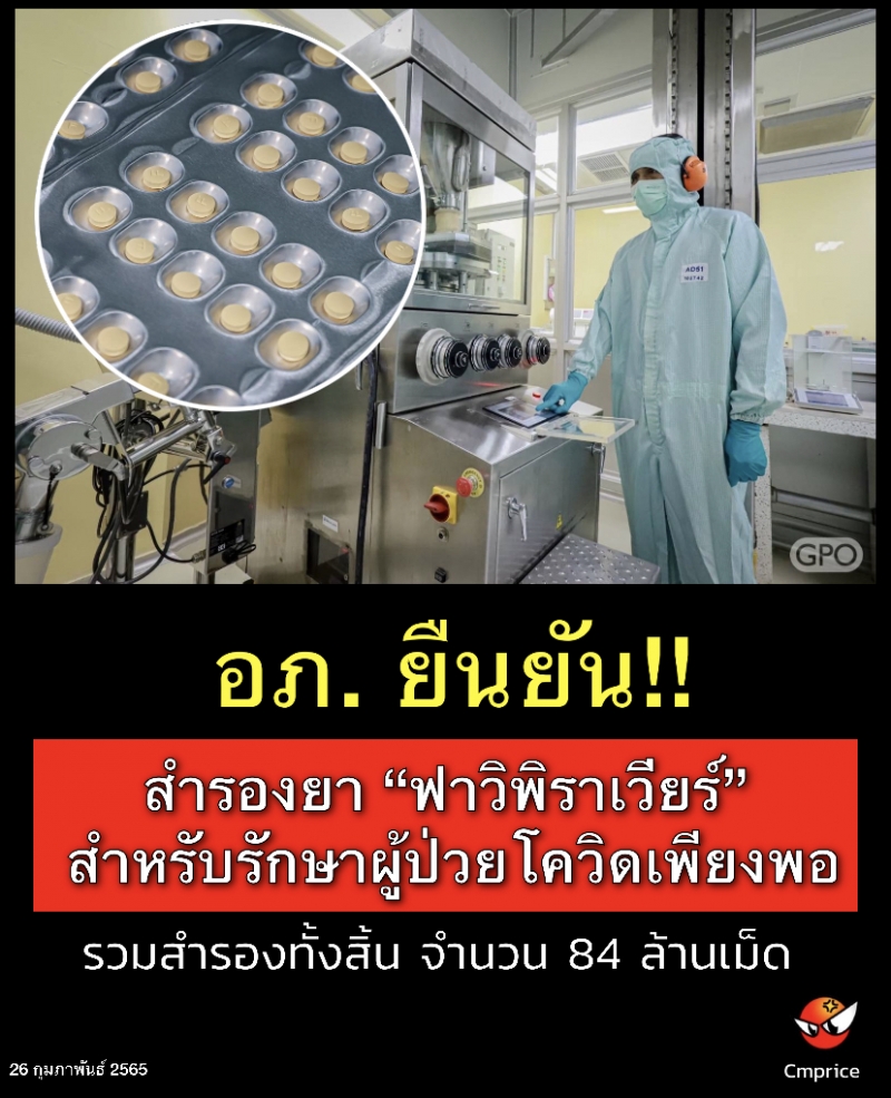 วันที่ 26 กุมภาพันธ์ 2565 ภญ.ศิริกุล เมธีวีรังสรรค์ รองผู้อำนวยการองค์การเภสัชกรรม (อภ.) กล่าวว่า ด้วยสถานการณ์การระบาดโรคโควิด-19 ในประเทศ ทำให้มีความต้องการใช้ยาฟาวิพิราเวียร์ ในการรักษาผู้ป่วยโควิด-19 องค์การเภสัชกรรม ได้มีการบริหารจัดการสำรอง "ยาฟาวิพิราเวียร์"(Favipiravir) ให้สอดคล้องกับสถานการณ์ดังกล่าว โดยขณะนี้มีการสำรอง จำนวน 24 ล้านเม็ด และทำการการผลิตเพิ่มเติมอีก จำนวน 60 ล้านเม็ดรวมการสำรองทั้งสิ้น 84 ล้านเม็ด เพื่อกระจายสู่หน่วยบริการแม่ข่ายอย่างต่อเนื่อง ทั้งนี้จำนวนดังกล่าว เป็นการสำรองอยู่ที่องค์การเภสัชกรรม นอกจากนี้ยังมีการสำรองไว้ที่หน่วยบริการต่างๆทั่วประเทศอีกจำนวนหนึ่ง