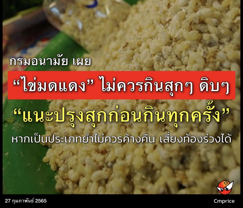 | • กรมอนามัย เผย ไข่มดแดง ไม่ควรกินสุกๆ ดิบๆ แนะปรุงสุกก่อนกินทุกครั้ง หากเป็นประเภทยำไม่ควรค้างคืน เสี่ยงท้องร่วงได้ |