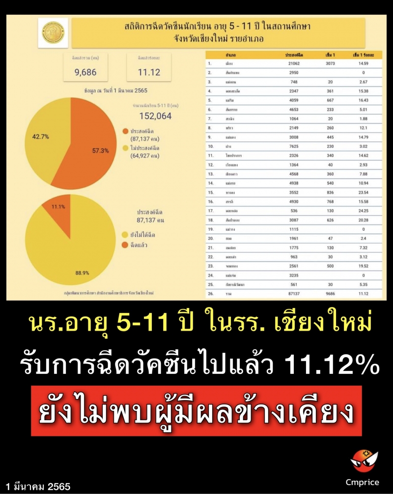 สำนักงานศึกษาธิการจังหวัดเชียงใหม่ เผยสถิติการฉีดวัคซีนป้องกันโควิด-19 ในกลุ่มนักเรียนอายุ 5-11 ปี พบทยอยฉีดไปได้แล้ว ร้อยละ 11.12 และยังไม่พบผู้มีผลข้างเคียง พร้อมขอเชิญชวนผู้ปกครองนำบุตรหลานสมัครเข้ารับการฉีดวัคซีน เพื่อสร้างภูมิคุ้มกัน และลดการป่วยรุนแรง