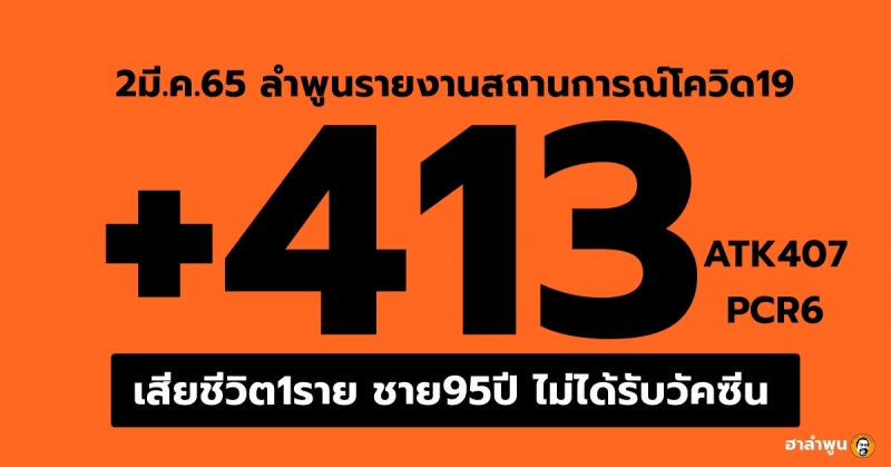 2 มี.ค.65 เพจศูนย์ข่าวโควิด 19 ลำพูน ได้รายงานสถานการณ์โควิด-19 จ.ลำพูน โดยเป็นข้อมูล ณ เมื่อวานนี้ เวลา 16.00น. พบผู้ติดเชื้อเพิ่ม 413ราย แบ่งเป็นการตรวจ RT-PCR ในจังหวัด 3ราย เป็นการตรวจ ATK 407ราย มาจากต่างจังหวัด3ราย