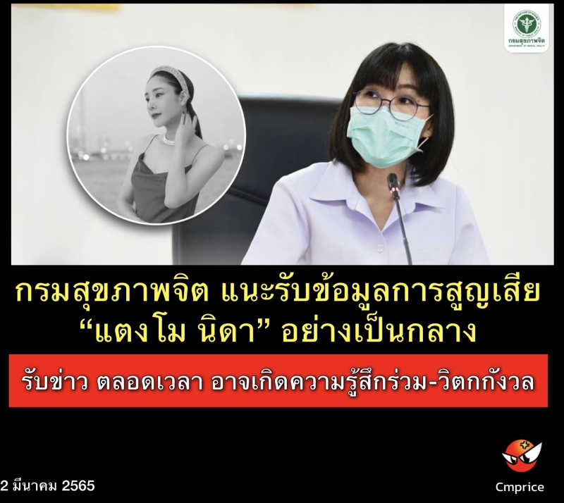 แพทย์หญิงอัมพร เบญจพลพิทักษ์ อธิบดีกรมสุขภาพจิต กล่าวว่า ท่ามกลางความเศร้าโศกจากการเสียชีวิตของ "คุณแตงโม-นิดา พัชรวีระพงษ์" นักแสดงชื่อดัง จากเหตุการณ์พลัดตกเรือกลางแม่น้ำเจ้าพระยา ซึ่งเป็นข่าวครึกโครมที่ประชาชนให้ความสนใจอย่างกว้างขวาง จนกลายเป็นกระแสสังคมที่สื่อทุกแขนงต้องการที่จะเผยแพร่ข่าวสารของนักแสดงสาว ประวัติของคนใกล้ชิด ครอบครัวรวมไปถึงประวัติของผู้ที่เกี่ยวข้อง จนอาจละเมิดความเป็นส่วนตัวอย่างคาดไม่ถึง แม้สื่อมวลชนจะมีเจตนาดีในการทำงานที่ต้องการให้ประชาชนเข้าใจข่าวสารในหลายๆ แง่มุม ซึ่งในบางประเด็นอาจจะทำให้เกิดการตีตราและ ตกเป็นจำเลยโดยที่การดำเนินการยังอยู่ในระบบยุติธรรม
