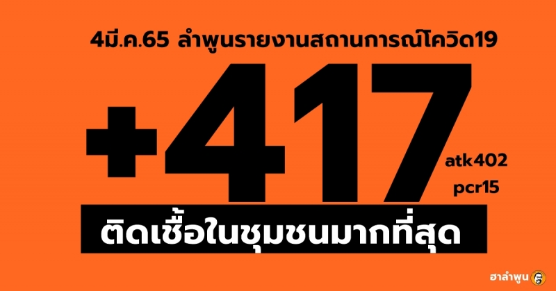 4 มี.ค.65 เพจศูนย์ข่าวโควิด 19 ลำพูน ได้รายงานสถานการณ์โควิด-19 จ.ลำพูน โดยเป็นข้อมูล ณ เมื่อวานนี้ เวลา 16.00น. พบผู้ติดเชื้อเพิ่ม 417ราย แบ่งเป็น