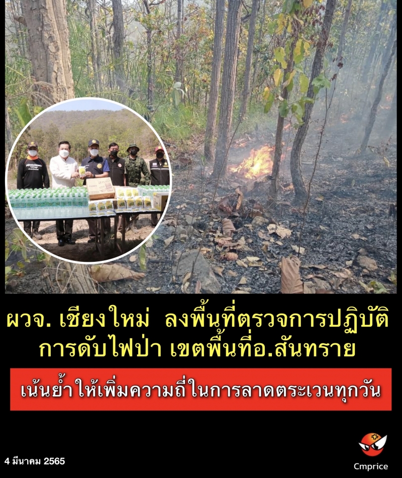 ผู้ว่าราชการจังหวัดเชียงใหม่ ตรวจการปฏิบัติการดับไฟป่า พร้อมเน้นย้ำมาตรการป้องกันการเกิดไฟป่า เพิ่มความถี่และความต่อเนื่องในการลาดตระเวนเฝ้าระวังผู้ที่จะเข้าไปแล้วก่อให้เกิดไฟป่า