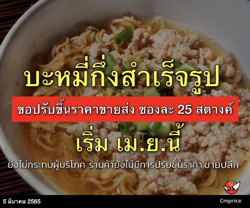 นายสมชาย พรรัตนเจริญ นายกสมาคมค้าส่งค้าปลีกไทย เปิดเผยว่า ตั้งแต่เดือน เม.ย.2565 เป็นต้นไป ผู้ผลิตบะหมี่กึ่งสำเร็จรูปอย่างน้อย 2 ราย ได้แจ้งขอปรับขึ้นราคาต้นทุนซองละ 25 สตางค์ เท่ากับเป็นการปรับขึ้นราคาขายส่งทางอ้อมกับร้านค้า ซึ่งจะส่งผลให้กำไรของร้านค้าปรับลดลงเหลือเพียงซองละ 75 สตางค์ จากเดิมที่ได้กำไรซองละ 1 บาท