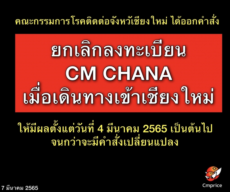 วันที่ 7 มี.ค. 65 คณะกรรมการโรคติดต่อจังหวัดเชียงใหม่ ได้ออกคำสั่งคณะกรรมการโรคติดต่อจังหวัดเชียงใหม่ ที่34/2565 เรื่อง ยกเลิกมาตรการควบคุมผู้เดินทางเข้ามาในพื้นที่จังหวัดเชียงใหม่ โดยระบุว่า ตามที่คณะกรรมการโรคติดต่อจังหวัดเชียงใหม่ ได้ออกคำสั่งคณะกรรมการโรคติดต่อจังหวัดเชียงใหม่ ที่ 81/2564 เรื่อง มาตรการควบคุมผู้เดินทางมาจากพื้นที่ควบคุมสูงสุดและเข้มงวด และอำเภอแม่สอด จังหวัดตาก เข้ามาในพื้นที่จังหวัดเชียงใหม่ ลงวันที่ 18 กรกฎาคม 2564 ประกาศคณะกรรมการโรคติดต่อจังหวัดเชียงใหม่ ที่ 17/2564 เรื่อง แนวทางปฏิบัติตามคำสั่งและประกาศคณะกรรมการโรคติดต่อจังหวัดเชียงใหม่เพิ่มเติม ลงวันที่ 21 กรกฎาคม 2564 และประกาศคณะกรรมการโรคติดต่อจังหวัดเชียงใหม่ ที่ 23/2564 เรื่อง มาตรการควบคุมผู้เดินทางมาจากพื้นที่ควบคุมสูงสุดและเข้มงวดเข้ามาในพื้นที่จังหวัดเชียงใหม่ ลงวันที่ 11 สิงหาคม 2564 โดยกำหนดให้ผู้เดินทางเข้ามาในพื้นที่จังหวัดเชียงใหม่ทุกคน จะต้องบันทึกข้อมูลลงในแอปพลิเคชัน CM-CHANA และให้รายงานตัวต่อเจ้าพนักงานควบคุมโรคติดต่อในพื้นที่ทันที