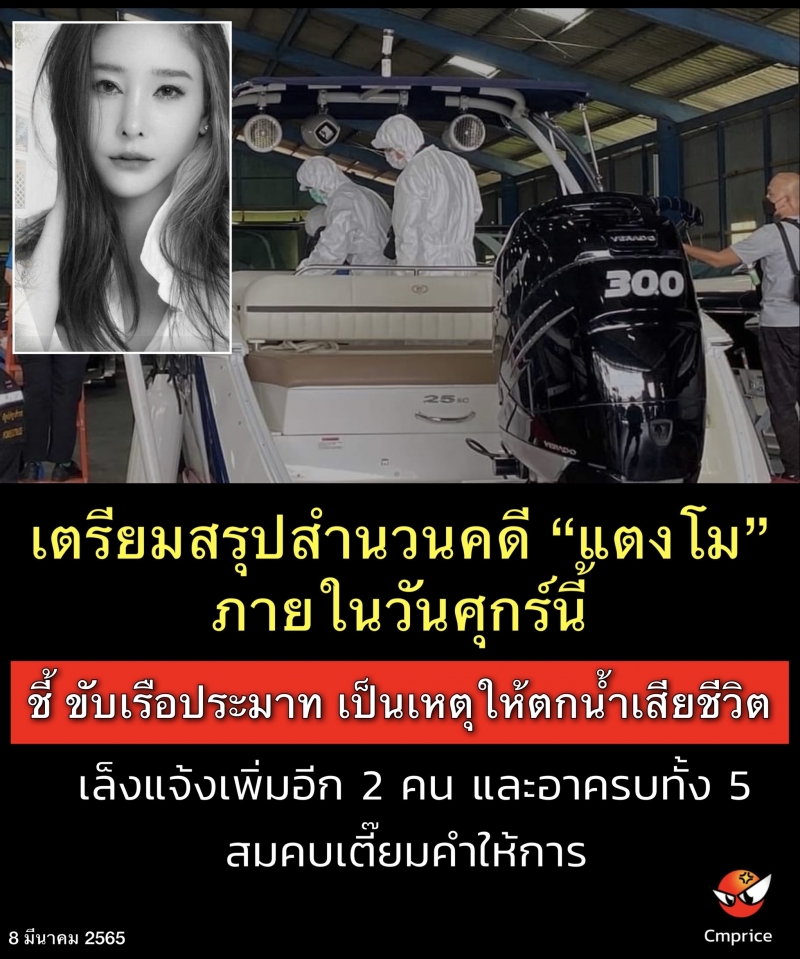 | • เตรียมสรุปสำนวนคดีแตงโม ภายในวันศุกร์นี้ ชี้ขับเรือประมาท เป็นเหตุให้ตกน้ำเสียชีวิต เล็งแจ้งเพิ่มอีก 2 คน และอาจครบทั้ง 5 สมคบเตี๊ยมคำให้การ |